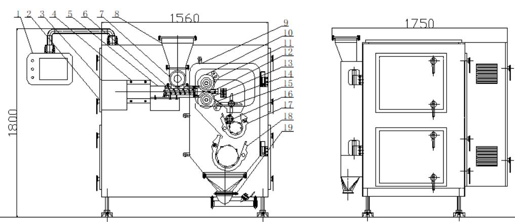 This machine use the residual water in raw material(water content 0.5~5%) to degas,press, granulate powder material into granules
