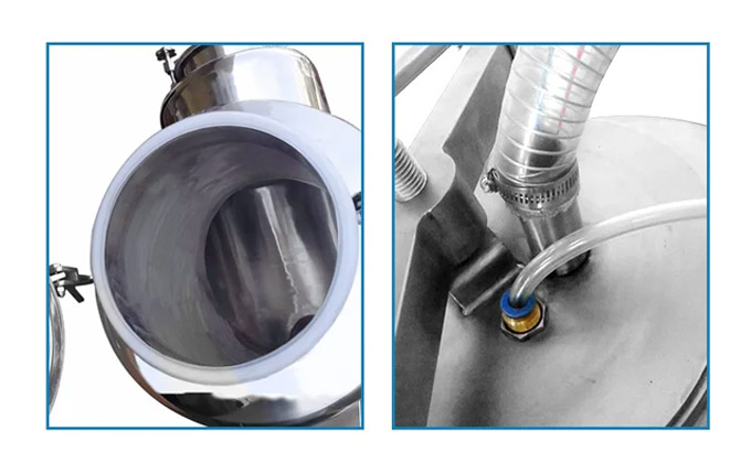 The mixing barrel structure is unique. The mixing efficiency is high. There is no corner that can not be reached. The barrel uses the stainless steel and its internal and external walls are polished. The outside appearance is beautiful. The mixing is uniform, with wide application. The mixer meets GMP standard.
